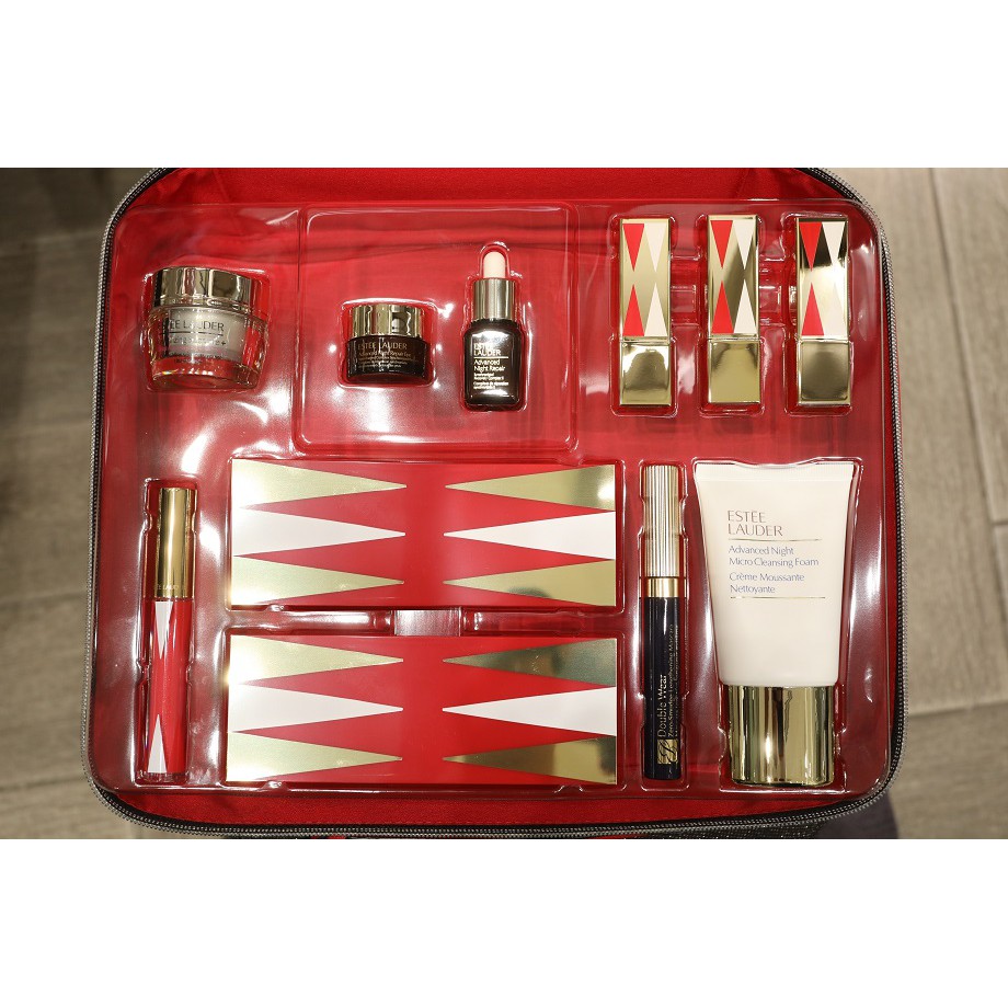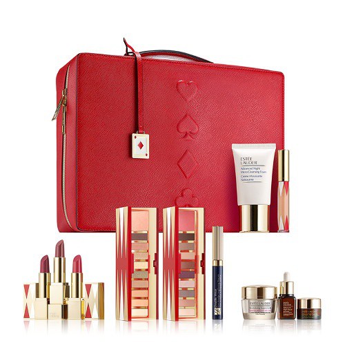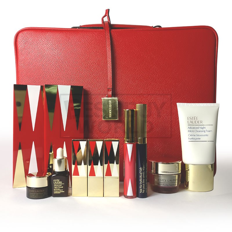 ESTEE LAUDER Supreme Deluxe gift set. Esteé Lauder brings some of its coveted cult favourites to its latest Radiant Skin gift set. Elegant red makeup case made with a beautiful velveteen material.